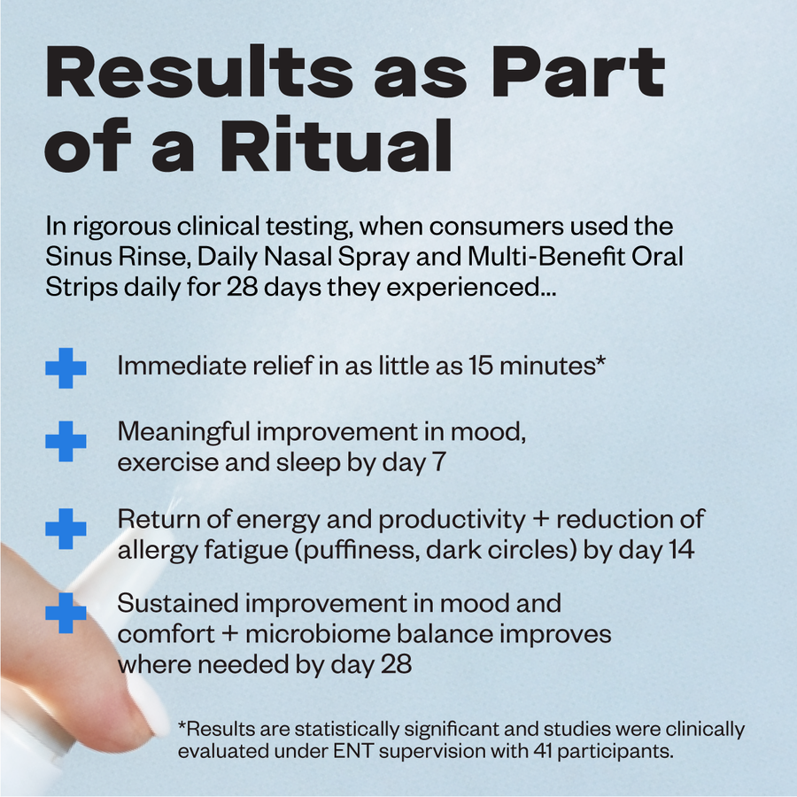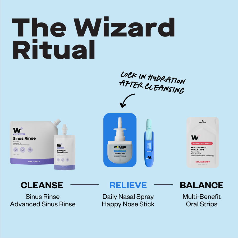 Absolutely—and it works best that way. Wizard is designed as a system, inspired by skincare routines. Start with our Sinus Rinse or Advanced Sinus Rinse to deeply cleanse. Follow with the Daily Nasal Spray for instant hydration and comfort. Then layer in our Multi-Benefit Oral Strips to support nasalbiome balance from the inside out. Used together, the full Wizard Ritual is clinically proven to deliver immediate comfort and help rebalance nasal microbiomes affected by dysbiosis within 30 days.